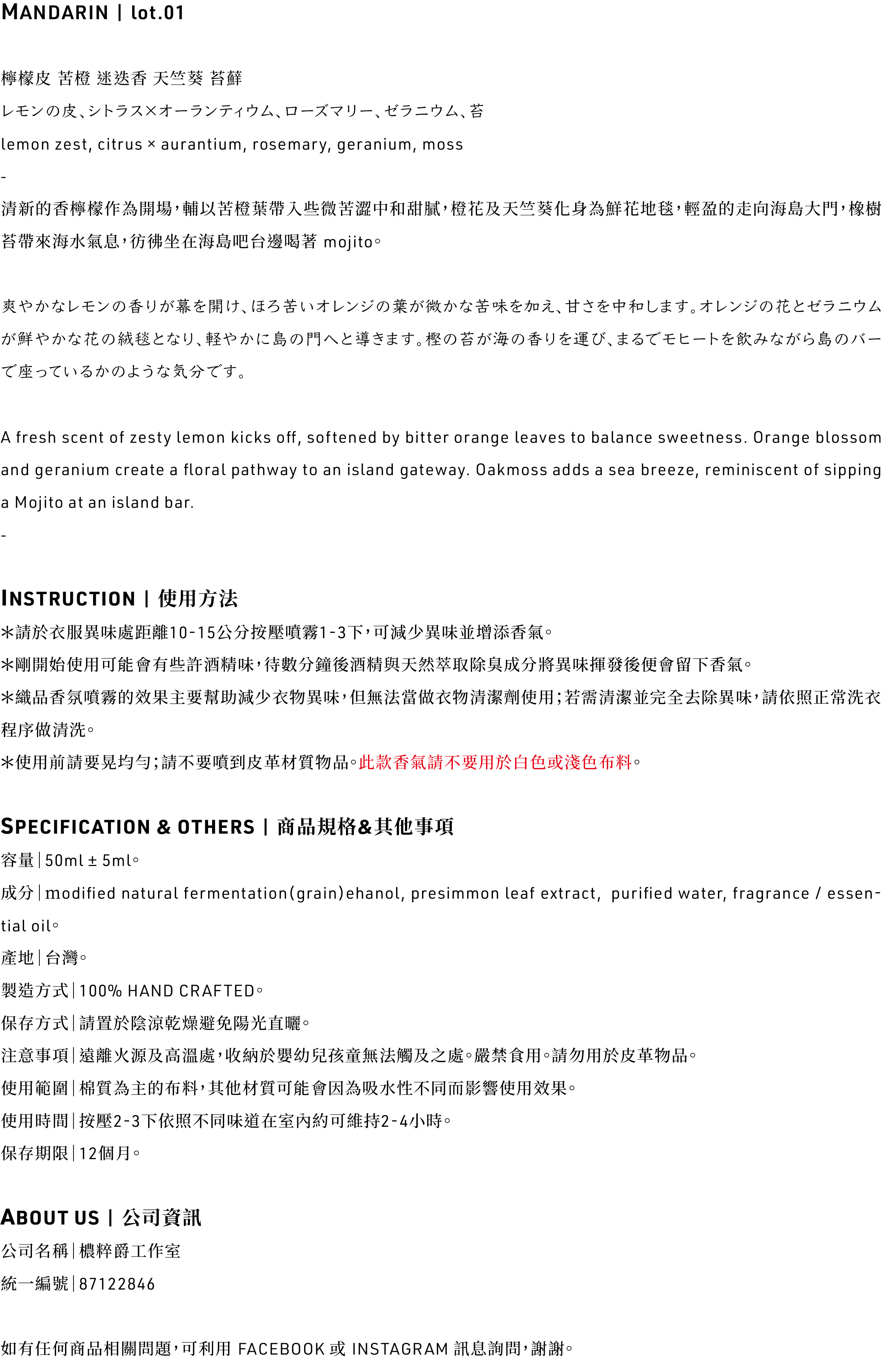 舉凡衣服、床單、窗簾、傢俱,天然萃取除臭成分能在短時間內消除異味,輕鬆地將香氣滲透到衣櫃或織品中;亦可作為空間噴霧,留下數小時的優雅氣息!