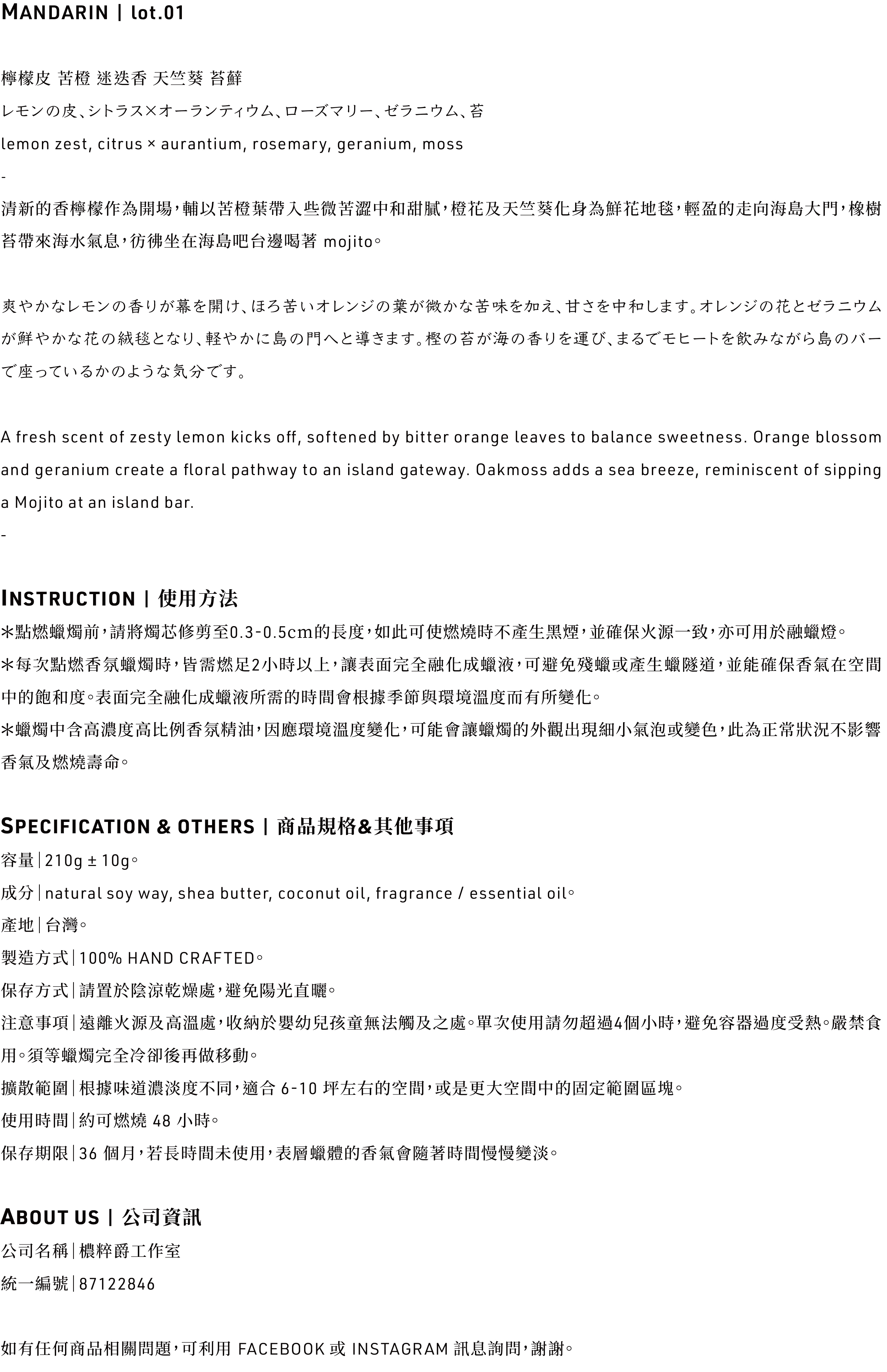 使用100%植物蠟為基底,獨家配方比例使燭面燃燒平整且不易產生黑煙,採用美國 FSC 認證永續林木生產木芯,燃燒時伴隨清脆的柴火聲響,帶來聽覺、視覺與嗅覺的三重感官享受!