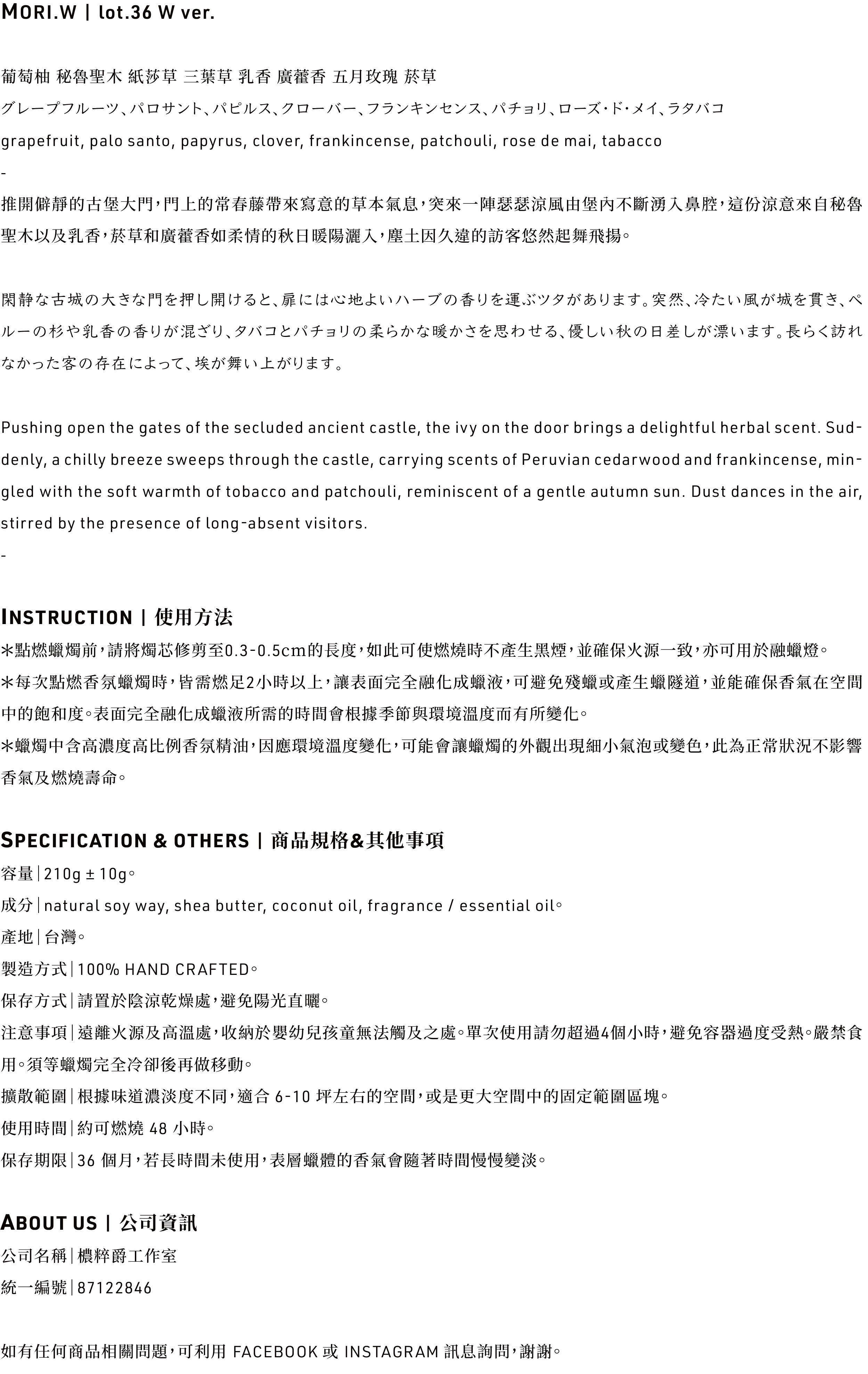使用100%植物蠟為基底,獨家配方比例使燭面燃燒平整且不易產生黑煙,採用美國 FSC 認證永續林木生產木芯,燃燒時伴隨清脆的柴火聲響,帶來聽覺、視覺與嗅覺的三重感官享受!