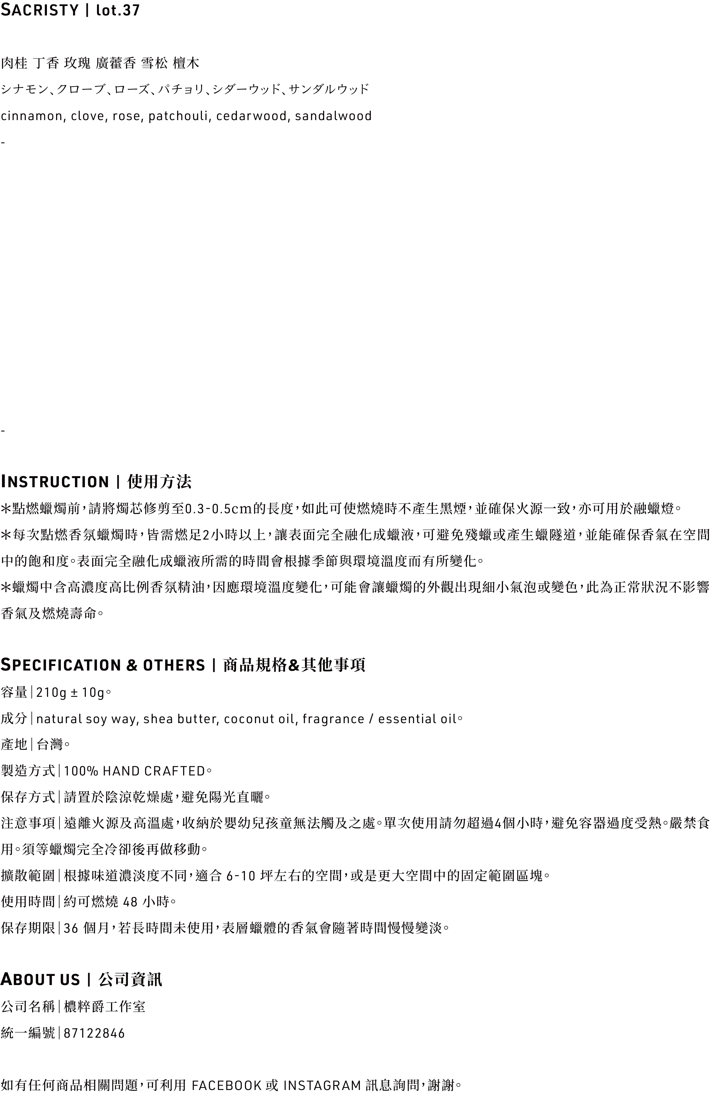 使用100%植物蠟為基底,獨家配方比例使燭面燃燒平整且不易產生黑煙,採用美國 FSC 認證永續林木生產木芯,燃燒時伴隨清脆的柴火聲響,帶來聽覺、視覺與嗅覺的三重感官享受!